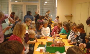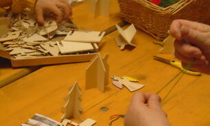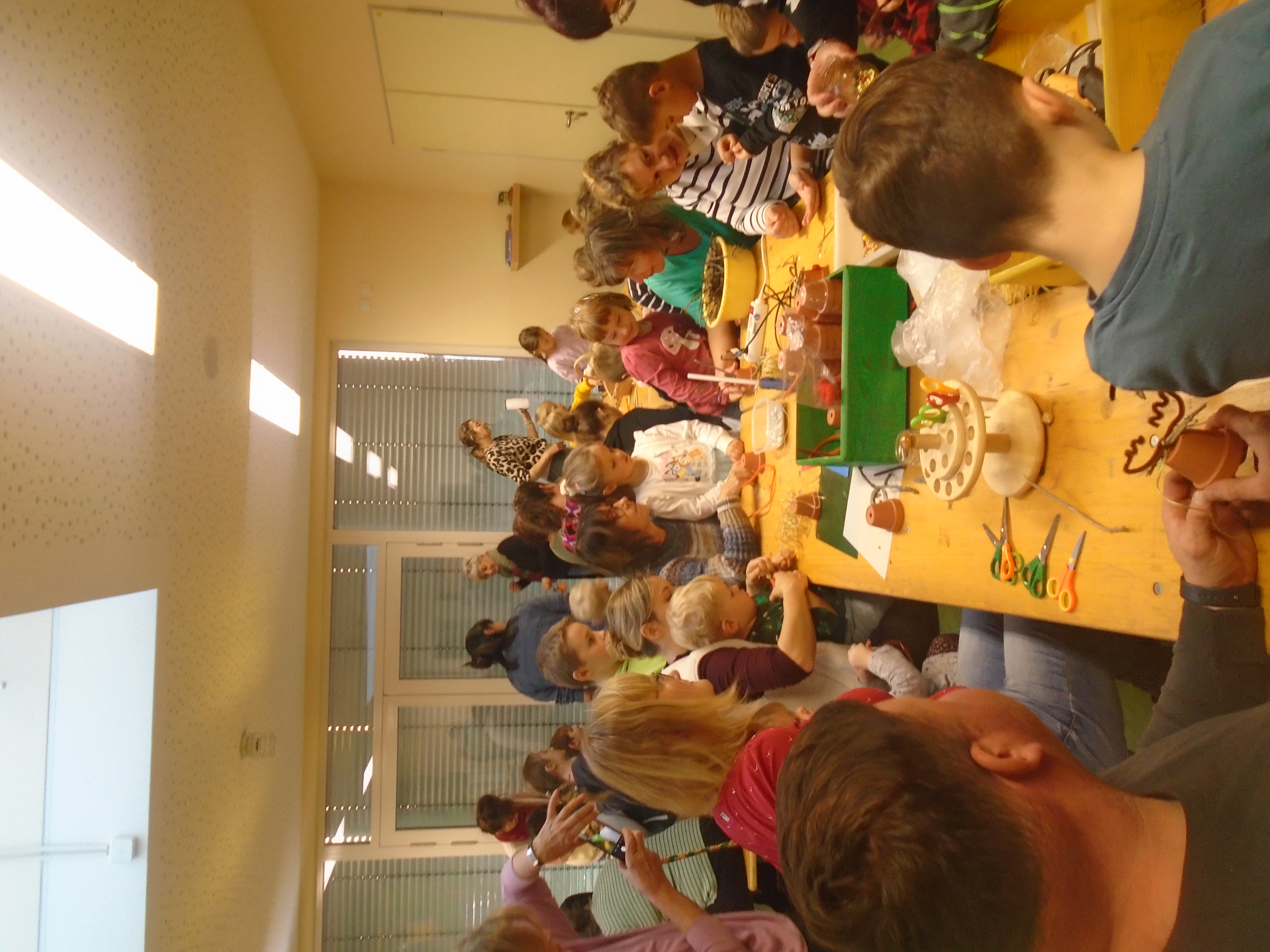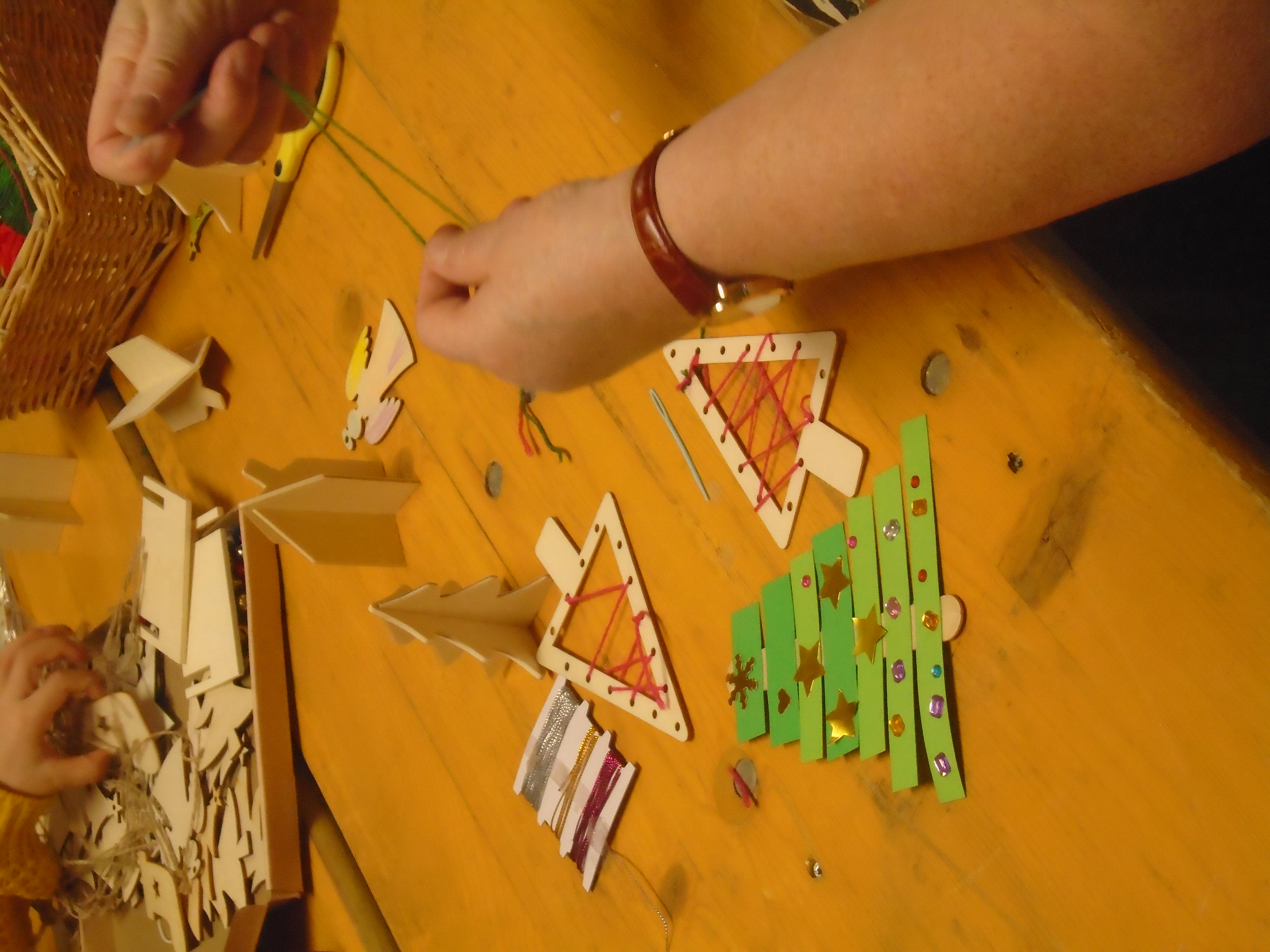 Der Einladung zum weihnachtlichen Basteln folgten viele Eltern. Auch die Kinder waren schon voller Vorfreude auf die besinnliche Kreativzeit. Es gab verschiedene Stationen. Während im Kreativraum fleißig Schneemänner und Tannenbäume aus Styropor angemalt und weihnachtliche Gestecke gebastelt wurden, konnte im Eingangsbereich die Geduld beim Fädeln auf die Probe gestellt werden. Es entstanden tolle Anhänger für den Christbaum.